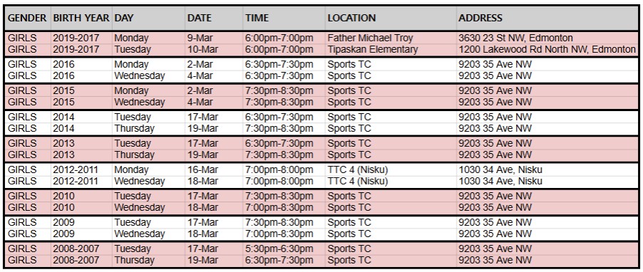 Girls Evaluations schedule